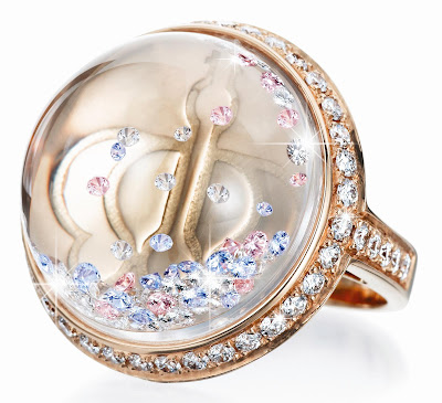 The “Diamond Jubilee Stars” is based on the same design introduced in 2009 that incorporates a clear half-sphere or full-sphere made of sapphire crystal filled with tiny diamonds. The crystal shells are filled with a clear silicone, which allow the diamonds to float inside the sphere jewelry in the same manner that paper confetti floats inside a snow globe.